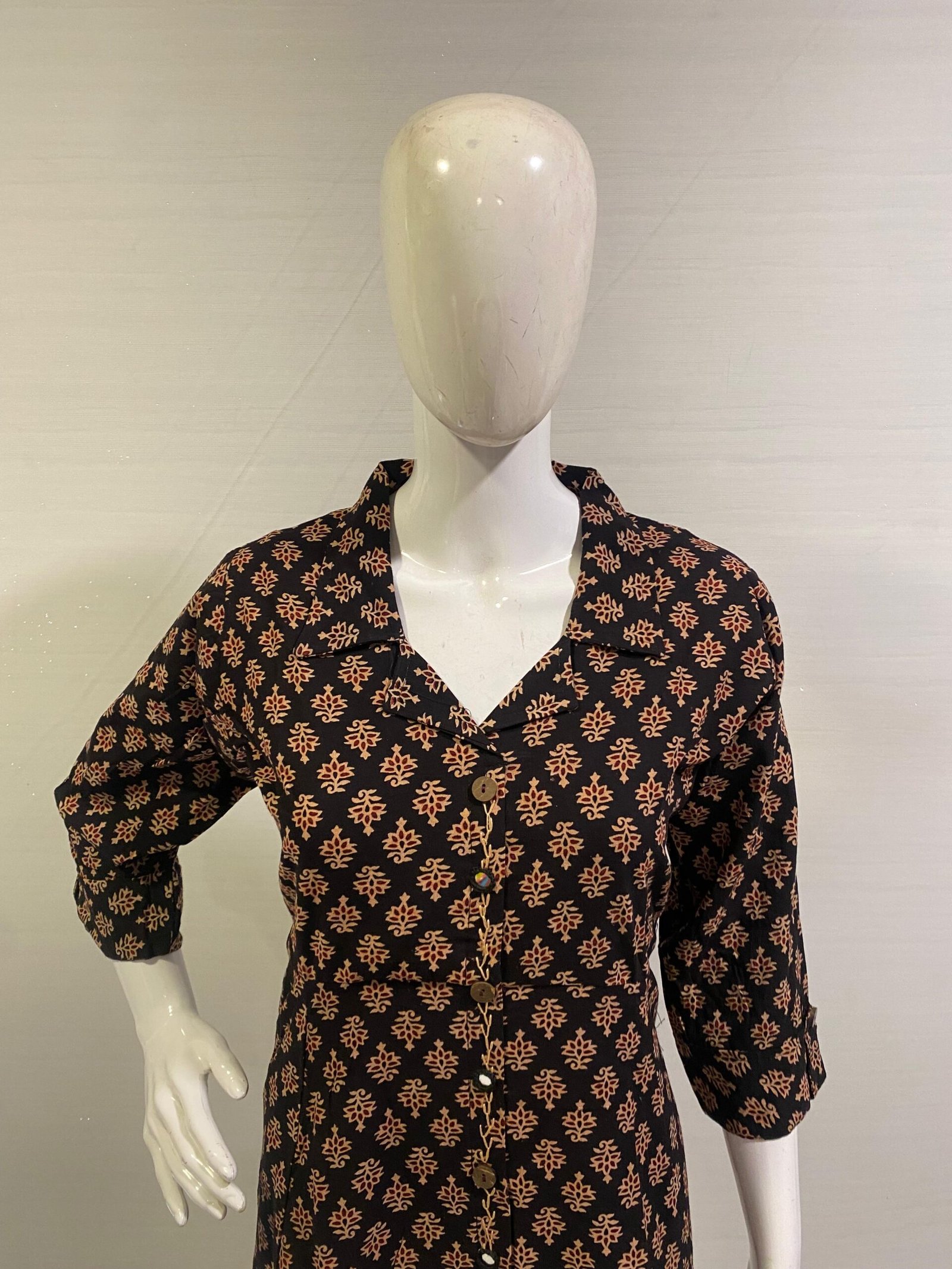 Cotton ajrakh embroidery mirror work laple collar Aline kurti with one side pocket dhs 65+vat