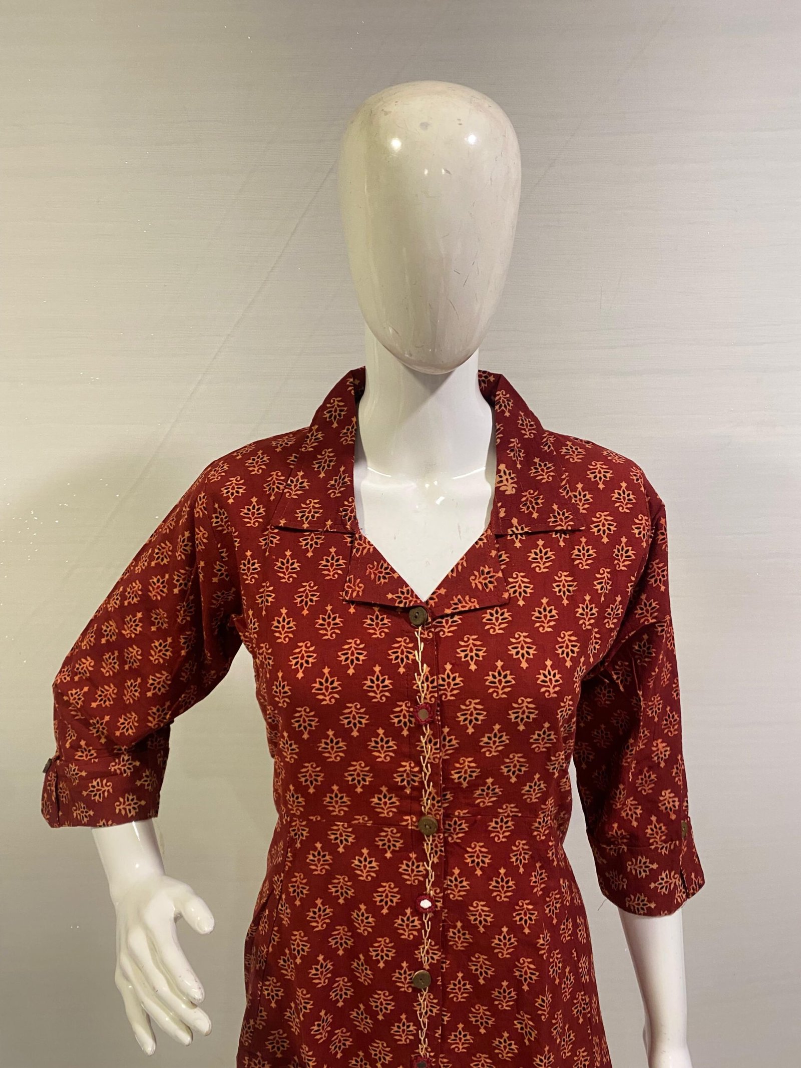 Cotton ajrakh embroidery mirror work laple collar Aline kurti with one side pocket dhs 65+vat
