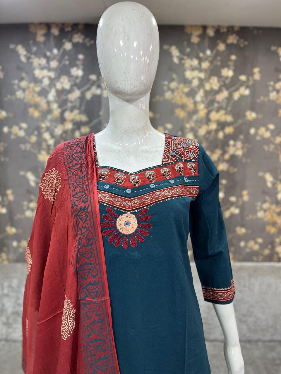Cotton embroidery mirror work and Ajrakh patch work kurti with printed pant and Dupatta 3 pcs set dhs 115+ vat