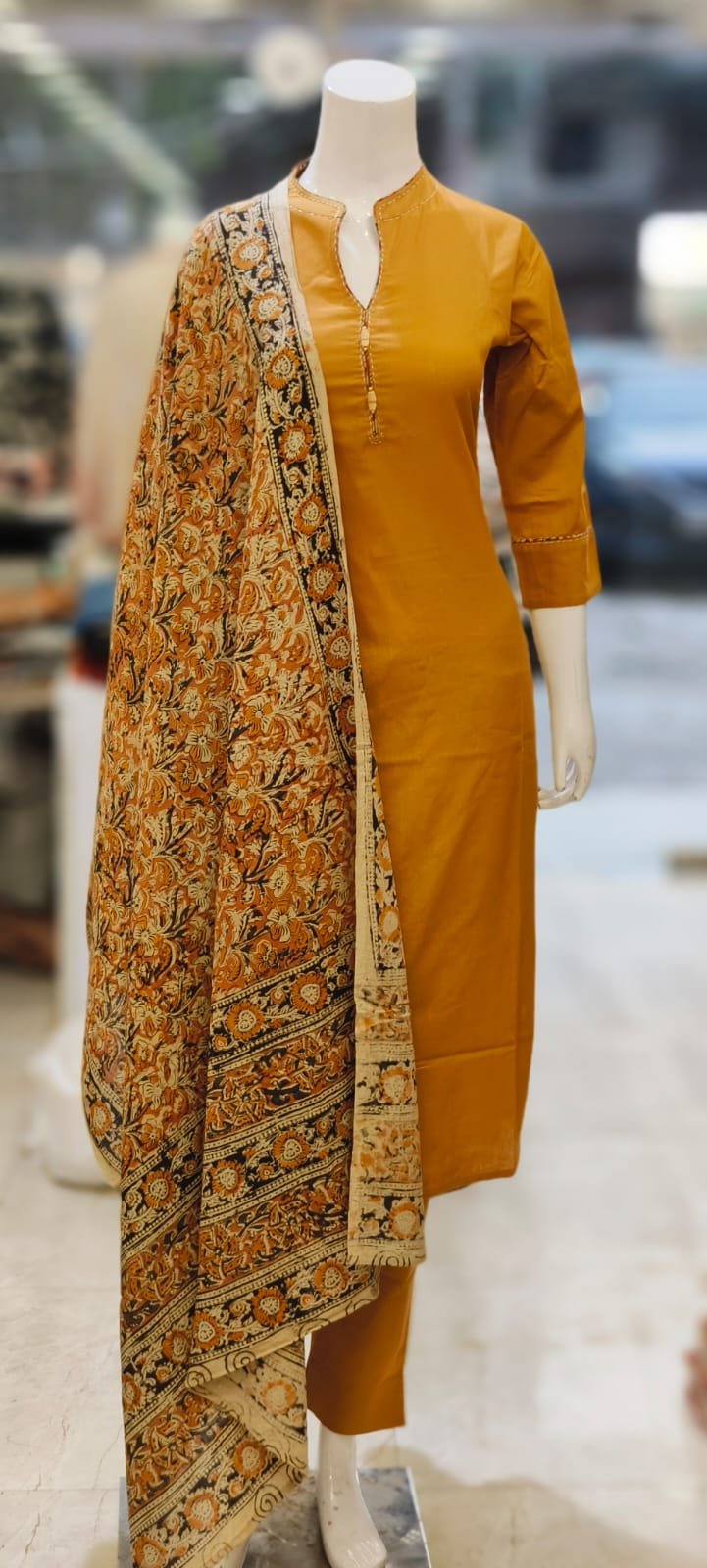 Cotton solid kurti with kalmkari dupatta and pant 3 pcs set dhs 125+vat