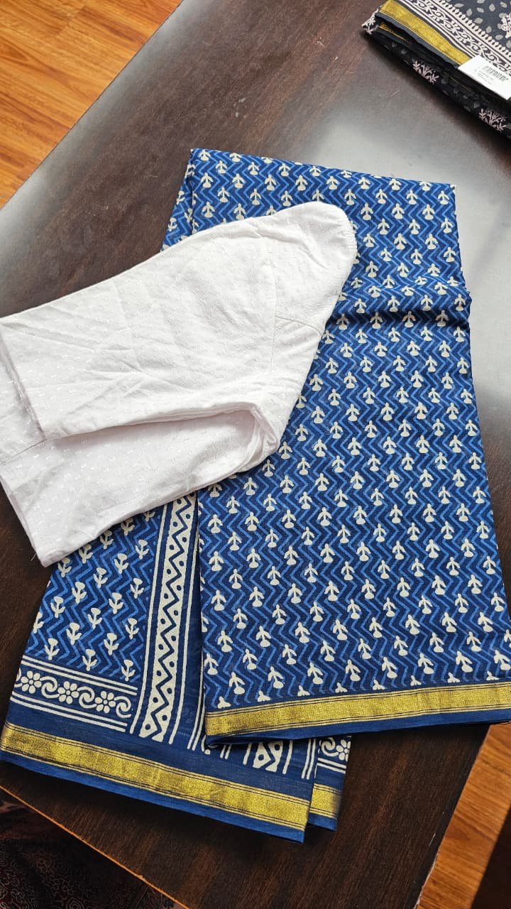 Cotton indigo saree with gold border with blouse dhs 88+ vat