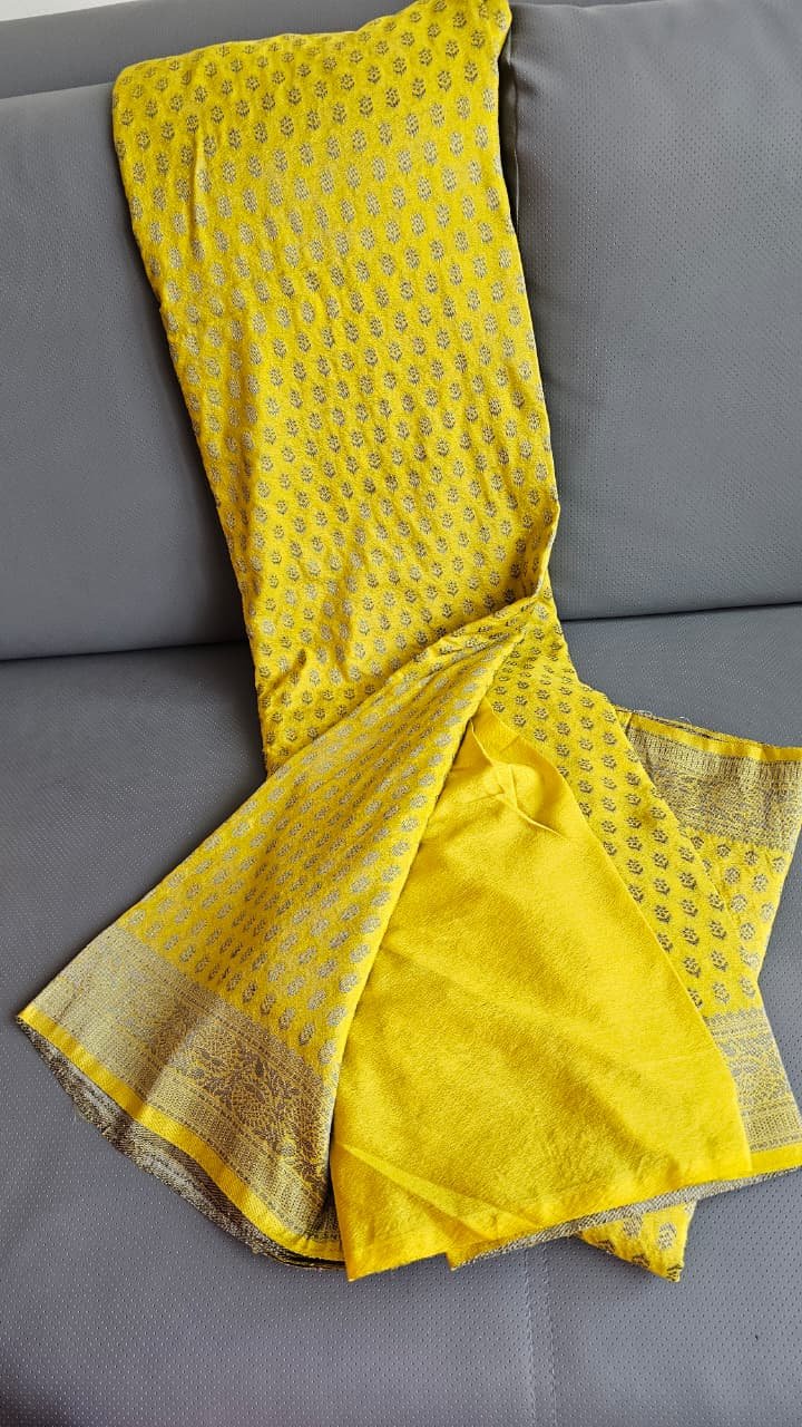 Home Sarees/jewellery Sarees Banarasi tissue silk lehanga golden with contrast chinnon Duppata matching Lehanga – full stitched with lining & zip Blouse – full stitched with lining Complete ready to wear Dhs 145 free delivery